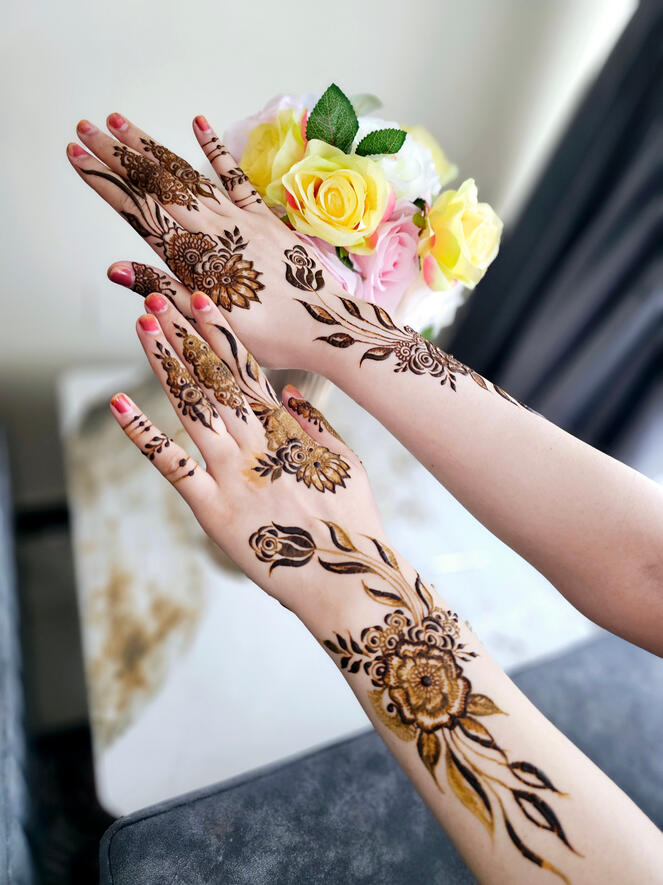we specialize in creating beautiful, custom henna designs tailored to your style. With years of experience, we offer everything from traditional bridal henna to modern, intricate patterns for any occasion. Our passion lies in making your special moments even more memorable with stunning henna art. Whether you're celebrating a wedding, festival, or simply want to enjoy a unique design, we bring the highest quality service to you.